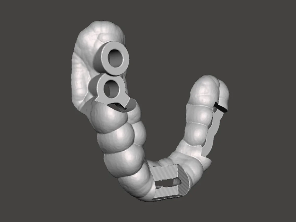 Vor dem Eingriff wird eine 3D-CT- bzw. CBCT-Aufnahme des Kiefers erstellt. Auf dieser Basis planen wir digital die exakte Position, Neigung und Tiefe des Zahnimplantats. Anschließend fertigen wir auf Grundlage dieser Planung eine individuelle chirurgische Bohrschablone (Guide) mittels 3D-Druck an. Während der Operation führt diese Schablone den Behandler präzise, sodass das Implantat exakt an der vorgesehenen Stelle eingesetzt wird - unter Schonung von Nerven, Blutgefäßen und Kieferhöhle.